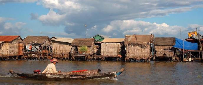 Kampong Pluk fishing village - continue to Kampong Pluk, is a cluster of three villages of stilled houses built within the floodplain about 16 km southeast of Siem Reap. The villages are primarily Khmer and have about 3000 inhabitants between them. Flooded mangrove forest surrounds the area and is home to a variety of wildlife including crab-eating macaques. During the dry season when the lake is low, the buildings in the villages seem to soar atop their 6-meter stilts exposed by the lack of water. At this time of year many of the villagers move out onto the lake and build temporary houses. In the wet season when water level rises, the villagers move back to their permanent houses on the floodplain, the stilts now hidden under the water. Kampong Pluk’s economy is, as one might expect, based in fishing, primary in shrimp harvesting.