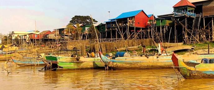 Kampong Klieng fishing village - transfer onward to Kampong Khleang, is located on the northern lake-edge about 35 km east of Siem Reap. It is more remote and less touristed than Kampong Pluk. Visitors during the dry season are universally awestruck by the forest of stilted houses rising up to 10 meters in the air. In the wet season the water rise to within one or two meters of buildings. Kampong Khleang is a permanent community within the floodplain of the Lake, with an economy based in fishing and surrounded by flooded forest. But Kampong Khleang is significantly larger with near 10 times the population of Kampong Pluk, making it the largest community on the Lake.